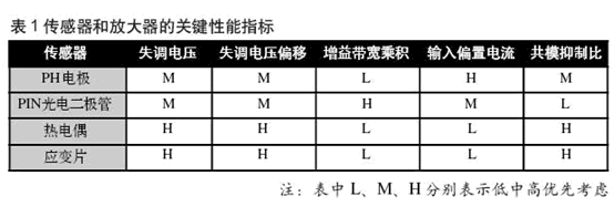 選擇放大器與傳感器正確接口時,設(shè)計人員必須使放大器與傳感器特性匹配。可靠的放大器特性對于傳感器——放大器組合的工作是關(guān)鍵性的。傳感器和放大器的關(guān)鍵性能指標見表1。例如,PH電極是一個高阻抗傳感器,所以,放大器的輸入偏置電流是優(yōu)先考慮的(表中的H)。PH傳感器所提供的信號不允許產(chǎn)生任何相當大的電流,所以,放大器必須是在工作時不需要高輸入偏置電流的型號。具有低輸入偏置電流的高阻抗MOS輸入放大器是符合這種要求的最好選擇。另外,對于應(yīng)用增益帶寬乘積(GBP)是低優(yōu)先考慮(表1中L),這是因為傳感器工作在低頻,而放大器的頻率響應(yīng)不應(yīng)該妨礙傳感器信號波形的真正再生。