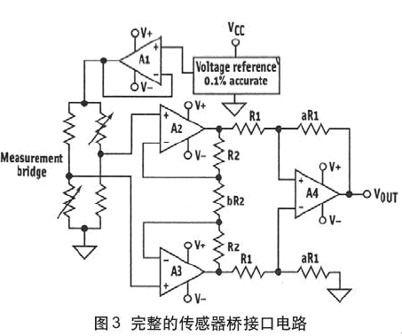 測量應(yīng)變片傳感器通常要通過橋網(wǎng)絡(luò),應(yīng)變片構(gòu)成橋的兩個(或4個)臂。應(yīng)變片是低源阻抗器件,其輸出信號范圍是小的(幾百微伏~幾毫伏)。圖3所示的電路能為精確測量傳感器信號提供測量橋穩(wěn)定激勵電壓和高共模電壓抑制(CMR),消除了任何共模電壓。用高精度和非常低漂移(隨溫度)的精密電壓基準驅(qū)動放大器A1。這可為橋提供非常精確、穩(wěn)定的激勵源。因為共模電壓大約為激勵電壓的一半,所以被測信號僅僅是橋臂之間小的差分電壓。放大器A2、A3、A4必須提供高共模抑制比(CMRR),所以僅測量差分電壓。這些放大器也必須具有低值輸入失調(diào)電壓(VOS)漂移(也稱之為失調(diào)電壓溫度系數(shù)TCVOS)和輸入偏置電流,以使得從傳感器能精確地讀數(shù)。放大器A1~A4連接成儀表放大器以達到上述目標。這種配置的電壓增益(AV)為:AV=(1+2R2/bR2)(aR1/R1),其中a和b是確定總增益的比值。