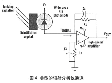 輻射譜測量來自輻射源的發(fā)射能量的分布,輻射源可以是粒子,X射線或γ射線。輻射照到閃光晶體上并發(fā)射強度正比于能量的短脈沖。然后由PIN光電二極管把光轉(zhuǎn)換為電流。放大器(見圖4)用做首置放大器和PIN光電二極管輸出的電流/電壓轉(zhuǎn)換器。此電路為用于基本輻射譜的單通道分析儀。信號的脈沖幅度包含重要信息,所以低輸入失調(diào)電壓和低失調(diào)電壓漂移是重要的。寬帶寬為處理脈沖(可窄到幾納秒)提供快速響應(yīng)。首置放大器輸出(VOUT)到脈沖幅度分析儀(如快速ADC)來測量和儲存每個峰值發(fā)生的數(shù)。分布是單個源的光譜。反饋電阻R1值取決于來自PIN光電二極管的最大電流和到ADC的最大輸出電壓。因此,R1=(Max VOUT)/(Max ISIGNAL)。電容C1用于PIN光電二極管寄生電容的補償。R2和C2相當于R1和C1用于補償放大器非倒相輸入的輸入偏置電流。