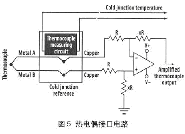 熱電偶根據(jù)兩個不同金屬線結(jié)點之間的溫度差提供電壓信號。熱電偶溫度傳感器具有一個感測端(金屬A/金屬B連接端)和一個參考端(金屬A和金屬B與銅導(dǎo)線連接端)。冷端參考溫度與熱電偶信號一道進行控制和測量。熱電偶具有大約10mV/℃~80mV/℃的小信號電平范圍和小的源阻抗。配置成差分放大器的單放大器(圖5)把信號放大到ADC輸入所需的電平。差分放大器增益為: