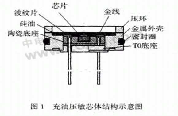 MEMS壓力傳感器的一一種重要封裝形式是采用充油的不銹鋼結(jié)構(gòu),稱為充油壓敏芯體,其基本制造工藝過程包括貼片、引線、封裝殼體、充油及二次組裝等。圖1是充油壓敏芯體結(jié)構(gòu)示意圖,圖2是壓力傳感器二次封裝樣品。