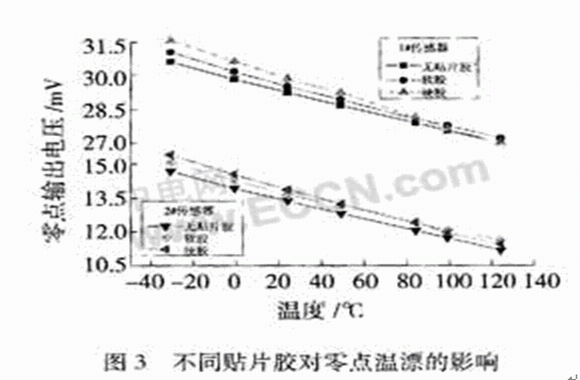 從圖3可以看出,貼片膠對傳感器零點的影響隨溫度變化而變化,在低溫時,使用了硬膠貼片的傳感器的零點明顯高于使用軟膠與無膠的,這種差別隨著溫度的升高變得越來越小。這主要有三個原因:①貼片膠的彈性模量隨溫度的升高而變小;②貼片膠高溫固化,在低溫時會引起收縮殘余應力;③貼片膠和芯片材料熱膨脹系數(shù)不同產(chǎn)生的熱應力。特別需要注意的是,在85℃之后,硬膠的影響突然變小,小到幾乎與無膠的情況相同。這是因為硬膠的玻璃化溫度(Tg)為85℃,高于Tg點時膠的楊氏模量變小,因而對傳感器的零點溫漂影響變小。因此,在選用貼片膠時,要求膠的Tg大于傳感器的工作溫度,以確保傳感器零點的穩(wěn)定性和工作的可靠性。