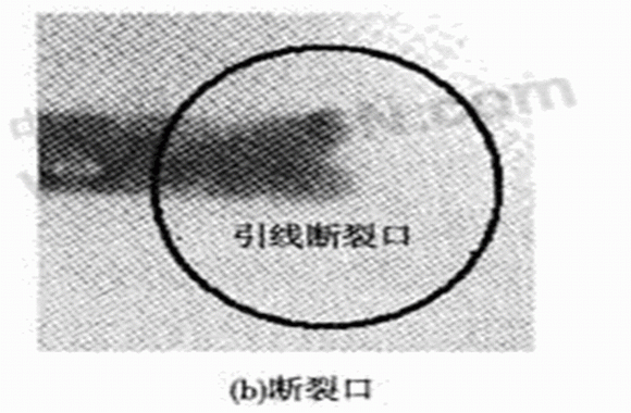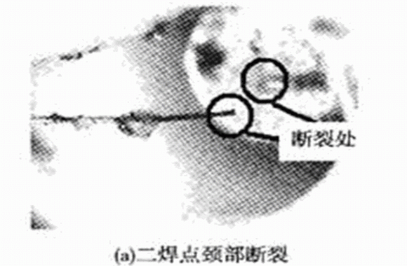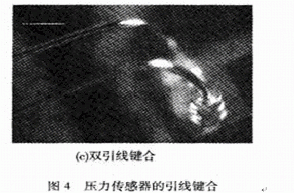 用于引線鍵合的鍵合線有Al線和Au線,由于Au線性能更優(yōu),所以壓力傳感器的鍵合工藝選用Au線。鍵合時要使鍵合面保持清沽,否則會影響鍵合強度,等離子清洗是一種能有效提高鍵合強度的方法。由于機油壓力傳感器工作環(huán)境惡劣,尤其是頻繁的振動會導致金絲有缺陷的地方疲勞斷裂,或者最容易疲勞的位置如第二焊點附近的頸部位置發(fā)生斷裂,因此要求更高的鍵合質(zhì)量。曾對所研制的機油壓力傳感器進行了臺架試驗,在一批試驗樣品中經(jīng)過6×105次加壓和卸壓試驗之后,發(fā)現(xiàn)有兩個樣品失效,故障分析結(jié)果表明:一個樣品的失效模式為信號處理電路上的一個電阻損壞;另一個樣品的失效模式為金絲線斷裂,如圖4(a),(b)所示。對于這種情況,可以采用雙金絲鍵合工藝,并盡量選用高純度、低缺陷的金絲,并做好引線鍵合前各封裝器件的清潔工作,如圖4(c)所示。這樣對金絲鍵合工藝進行改進后,在可靠性試驗中,未曾出現(xiàn)金絲斷裂的質(zhì)量問題。