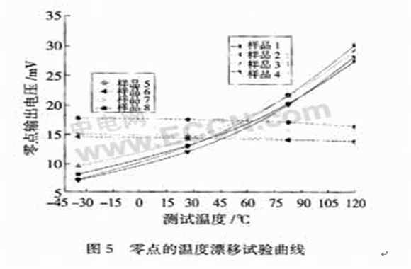 由于芯片對所處環(huán)境的要求比較特殊,所以與硅芯片接觸的硅油需要具備以下特點:良好的介電性能、盡可能小的熱脹系數(shù)、化學穩(wěn)定性好以及耐熱和耐寒性能好。硅油的凈化處理是薄膜隔離式壓力傳感器封裝中至關重要的工藝步驟,因為若凈化不干凈,硅油或傳感器受壓部分的充油腔內(nèi)就會混有氣體、水分等可壓縮、易揮發(fā)的物質(zhì),在全溫區(qū)內(nèi)的體積變化就會沒有規(guī)律可言,造成外界的待測壓力不能準確、規(guī)則地傳遞到芯片,從而使得壓力傳感器的溫漂比較嚴重。這種現(xiàn)象反映在零點的溫漂上,可以用來評價封裝的好壞。通常,由于在恒壓源激勵的情況下壓力傳感器的靈敏度溫度系數(shù)為負值,所以壓力傳感器的零點稍有下降,如圖5的樣品5,6,7,8所示;而硅油凈化不充分的壓力傳感器零點的溫漂卻非常大,且隨著溫度的升高而升高,如圖5中的樣品1,2,3,4所示。試驗表明,像樣品1,2,3,4這類溫漂很大的傳感器的溫度補償是比較困難的,所以封裝時必須確保硅油品質(zhì)和填充量恰到好處。