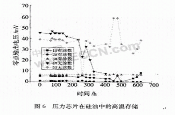 1#,2#,3#涂敷了保護層,4#,5#沒有涂敷保護層。可以看到,沒有保護層的傳感器在高溫下存儲了約200 h后,它的零點突然發(fā)生了變化,之后數(shù)據(jù)不穩(wěn)定;涂了保護層的壓力傳感器的零點在600多小時后仍然很穩(wěn)定。因此,為了防止硅油的污染導致壓力傳感器的失效,我們采取了一些必要的措施。首先,選擇高溫下盡可能穩(wěn)定的硅油;其次,盡量選擇具有良好鈍化層的芯片;最后,在不影響靈敏度的前提下,還可以在封裝過程中對芯片以及引線進行涂敷鈍化層的處理。