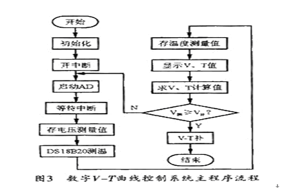 本系統程序主要包括主程序、讀出溫度子程序、溫度轉換命令子程序、計算溫度子程序、顯示數據刷新子程序等。編程時必須嚴格按照DS18B20的時序規定進行。尤其需要注意的是,在多點溫度測量中,由于多個DS18B20掛在一條總線上,為識別不同的器件,在系統安裝之前,應將主機逐個與DS18B20掛接,以讀出其序列號。具體是由主機先給DS18B20發一個復位脈沖,在DS18B20發回響應脈沖給主機后,主機再發讀ROM命令(代碼33H),并發一個15μs左右的脈沖,接著再讀取DS18B20序列號的一位,并用同樣方法讀取序列號的每一位。其V-T曲線控制系統主程序和測溫子程序分別如圖3和圖4所示。