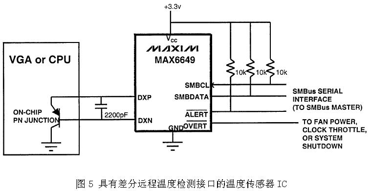 圖5為筆記本電腦普遍使用的一種溫度控制方案。溫度傳感器IC通過SMBus接口連接到筆記本電腦的嵌入式微控制器,由于溫度傳感器IC與嵌入式微控制器之間為數字接口,因此溫度傳感器IC在位置上可以遠離嵌入式微控制器而不會有噪聲干擾問題。MAX6649同時內置一個本地溫度傳感器和用于連接遠端二極管的差分接口。MAX6649的IDH=100uA,IDL=10uA,高精度、小電流的電流源可減小因雜散電阻所產生的測量誤差。差分輸入有助于降低噪聲干擾。圖5所示電路,溫度傳感器IC只負責溫度檢測,風扇轉速控制由嵌入式微控制器完成,由軟件實現。為了避免軟件控制的死機問題,MAX6649還集成了保護功能,當溫度到達第一個高溫臨界點時,MAX6649 ALERT可發出中斷請求,要求嵌入式微控制器進行相應的處理,例如對處理器進行降頻;如果上述對策仍無法有效抑制溫度的上升,當溫度達到第二高溫臨界點時,MAX6649 OVERT可以用來控制系統的第二個風扇或對系統進行強制關機。圖5具有低成本、高精度、使用彈性大等優點,但在軟件的設計上需花費較多的功夫。