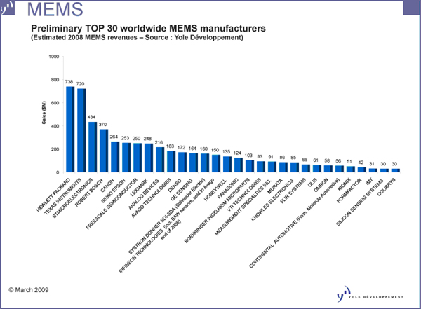 - 市場研究公司Yole Developpement近日發布2008年MEMS廠商排名