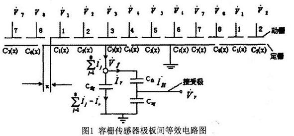 相應的信號源全部落在這些電容上,同樣,對傳感器的輸出信號無影響。如果給容柵傳感器每組發射極板上所加的發射電壓V1~V8為8路頻率、幅值相同而相鄰小極板間相位相差為π/4的正弦交變電壓,則在發射極上有電壓Vf,在接收極上有電壓Vr。應用交流電路理論及基爾霍夫電流定律,解讀圖l的等效電路,如下: