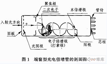 光電倍增管是一種真空器件。它由光電發射陰極(光陰極)和聚焦電極、電子倍增極及電子收集極(陽極)等組成。典型的光電倍增管按入射光接收方式可分為端窗式和側窗式兩種類型。圖1所示為端窗型光電倍增管的剖面結構圖。其主要工作過程如下: