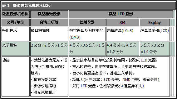 由于便攜式裝置內建微型投影機風潮興起,市場對于微型投影機的尺寸要求更加嚴苛。有業內人士表示,相比發光二極管(LED)光源微型投影技術(表1),激光微型投影具有無限焦距、光機體積小、色彩飽和度高、低耗能等特性,后勢深具潛力。