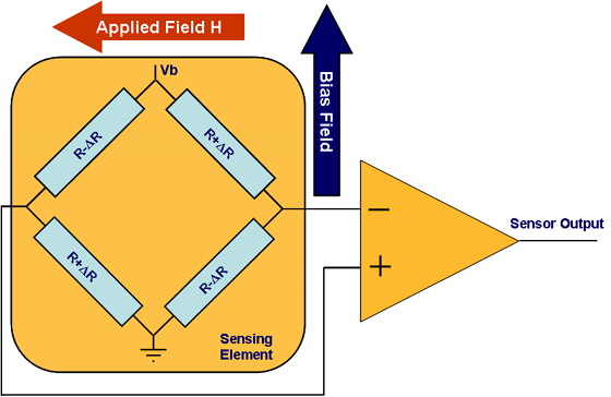 當(dāng)在一個很薄的鐵條上施加磁力線方向與經(jīng)過鐵條的電流方向垂直的磁場時,鐵條內(nèi)的電阻就會發(fā)生變化。這種傳感器通常采用單臂電橋形式,如圖所示,電橋由靜態(tài)阻值相同的磁阻構(gòu)成。在測量過程中,電橋上施加電壓Vb,使電流通過電阻。只要磁場H存在,在兩組四個相反放置的電阻器中,第一組兩個電阻的磁化矢量轉(zhuǎn)向電流,使電阻值變大;而另兩個電阻的磁化矢量背離電流,使電阻值變小。在線性范圍內(nèi),傳感器輸出與所施加的磁場強度成正比。