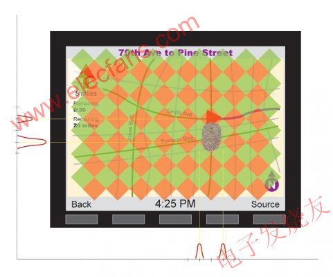 通過比較當(dāng)前基于電阻式觸摸屏和帶手勢識別的電容式觸摸屏的汽車HMI概念,我們可以發(fā)現(xiàn),新增手勢識別功能后,駕駛?cè)藛T對路面的關(guān)注程度在某些方面有所改善。通過電容式觸摸屏的手勢識別不僅是一種新的輸入方式,更使系統(tǒng)輸入提升到了一個(gè)新的層次。采用電容式觸摸屏,駕駛?cè)藛T仍然可以通過點(diǎn)擊瀏覽菜單結(jié)構(gòu),滑動(dòng)手指提高音量或者調(diào)節(jié)HVAC風(fēng)扇速度。不過,真正重要的是其控制標(biāo)準(zhǔn)功能的簡易度,比如控制駕駛過程中非常必要的導(dǎo)航功能。用戶不必緊盯著屏幕,只需一個(gè)簡單的手勢即可實(shí)現(xiàn)縮小操作。屏幕上的任何區(qū)域都可以感知手勢,因此駕駛?cè)藛T不必把手指放在特定的位置來完成操作。圖1顯示就是這種導(dǎo)航屏幕上的動(dòng)作感知說明。