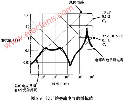上式計算了圖8.9中電容C2和電容陣列C3的曲線。圖8.9中假設C2和C3電容陣列的每個元件的ESR都為0.1歐,總的電路板面積為10IN的2次方,電源的和地之間有0.01IN厚的FR-4電介質。