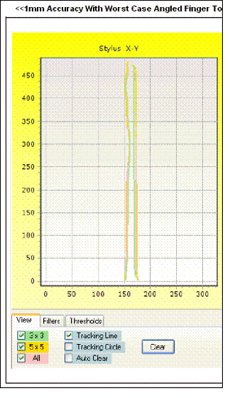 精確度:精確度可定義為,在一個預先定義的觸摸屏區域中最大的定位誤差,以手指的實際位置與測量位置之間的直線距離為單位。在測量精確度時,使用的是一只模擬或機械手指。手指置于面板上的一個準確位置,再把手指實際位置與測量位置進行比較。精確度非常重要,使用者希望系統能準確地找到手指位置。電阻式觸摸屏最令人詬病的一項缺點,就是低準確度,而且準確度會隨時間逐漸減弱。電容式觸摸屏的精確度創造出許多新應用,例如虛擬鍵盤,以及不用觸控筆的手寫辨識。圖1顯示一個結構不完整的觸控面板數據,顯示手指位置有游移現象,而實際上模擬手指是進行直線移動。