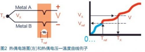 熱電偶是溫度測(cè)量中最常用的傳感器。其主要好處是寬溫度范圍和適應(yīng)各種大氣環(huán)境,而且結(jié)實(shí)、價(jià)低,無需供電,尤其最便宜。熱電偶由在一端連接的兩條不同金屬線(金屬A和金屬B)構(gòu)成,如圖1所示。當(dāng)熱電偶一端受熱時(shí),熱電偶電路中就有電勢(shì)差。可用測(cè)量的電勢(shì)差來計(jì)算溫度。