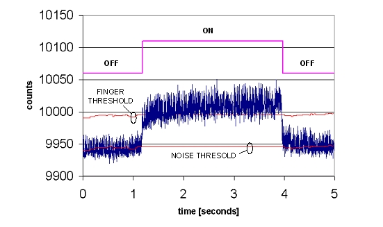 通過一個終端仿真程序,在主PC上獲得差分計數,然后借助電子制表軟件加以繪制。將手指放置在10mm厚的玻璃覆蓋層上,并持續3秒的時間。按鍵的開關狀態被疊加在原始計數上。按鍵在這兩種狀態之間干凈利落地轉換,即使是由于通過厚玻璃進行檢測而使原始計數信號中具有較大的噪聲時也是如此。請注意手指和按鍵門限隨著基線的漂移而進行周期性調整。當檢測到手指的觸壓動作時,基線值將鎖定,直到手指移開為止。