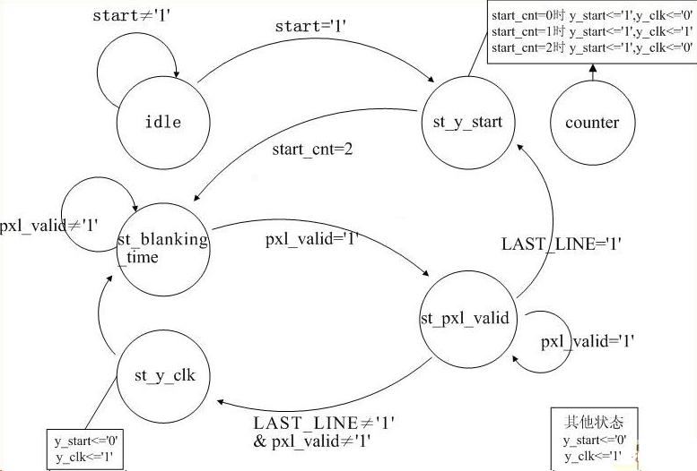CMOS圖像傳感器結構簡單,內部集成度高,因此僅需很少的外部控制信號即可完成視頻圖像的采集輸出。系統工作過程如下:當系統上電后,CPLD產生復位信號復位整個芯片到初始狀態,然后對芯片進行并行數據注入,向CMOS圖像傳感器的特殊寄存器寫入預定值,設置諸如像元積分時間,像素讀出行數,輸出放大器增益等參數。隨后CPLD給CMOS芯片提供 ss_start信號,標志開始像素積分,ss_stop信號結束像素積分,隨后圖像傳感器即處于可讀出狀態。向CMOS發出y_start信號開始一幀圖像的讀出,發出y_clock信號,開始一行圖像的讀出,當CMOS圖像傳感器有像素信號輸出時, pxl_valid引腳信號為高,此時CMOS圖像傳感器正在進行一行圖像的輸出,當pxl_valid變低時,一行圖像輸出結束,CPLD再提供下一個y_clock信號,啟動CMOS進行下一行圖像的讀出。當一幀圖像的最后一行開始讀出時,CMOS芯片的LAST_LINE引腳變高,標志一幀圖像讀出的結束,CPLD再產生下一個ss_start信號,開始下一幀圖像的讀出。這樣,CMOS就在CPLD的時序控制下,正常工作,循環讀出圖像。