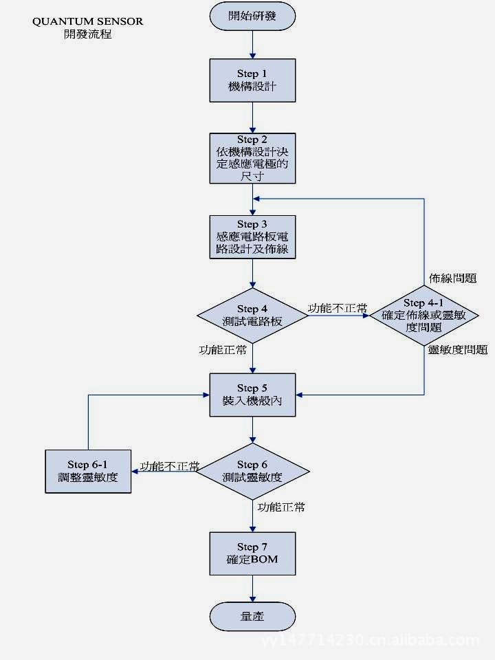 使用電容式感應的IC設計感應開關電路板與其它電路的開發流程略有不同,因為電容式開關的設計上會受到機構與其它電路設計上的影響,會有比較多的調整程序,所以需要一個比較復雜的開發流程,現就以出道較早且具有代表性的“Quantum ”產品的開發流程及要點介紹給大家,希望對需要的朋友有所幫助。下圖是開發流程圖: