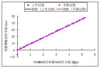 在進行實驗研究時,選取了一種壓阻式MEMS微型壓差敏感芯體,在組裝傳感器之前,采用了FLUKE 718 10G型壓力校準儀(Pressure Calibrator)對芯體進行標定。FLUKE 718 10G型壓力校準儀通過其自帶的一個主氣泵和一個微調氣泵可以輸出穩(wěn)定的-12~30psi(-83~207KPa)氣壓,精度達到±0.05%滿量程。實驗所用的MEMS芯體額定工作壓力量程為6KPa(安全工作壓力十倍于滿量程),在10.00+/-0.01V激勵電壓下,用FLUKE壓力校準儀標定結果如下: