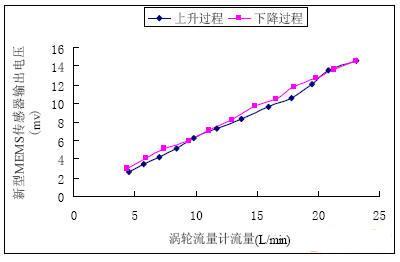 新型MEMS傳感器的標定是通過渦輪流量計來實現(xiàn)的。采用串聯(lián)在系統(tǒng)中的CLG15耐高壓渦輪流量計(名義精度為0.5%)和SO64C-1型流量測試儀進行標定。