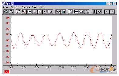 在動態(tài)試驗中,保持液壓泵提供20L/min的工作流量,使用Wavebook512信號系統(tǒng)對MEMS傳感器輸出流量信號進行采集,如圖7所示。盡管受到系統(tǒng)內(nèi)閥口、管路等造成的干擾,而且由于柱塞泵各柱塞在制造、安裝以及使用中產(chǎn)生的誤差和磨損造成的不均勻現(xiàn)象,導致流量波動曲線有些變形,但是還是可以很清晰的看出流量的波動周期約為60ms,即頻率16.7Hz。由于電動機工作在50Hz頻率,額定轉速1000r/min,因此相應的軸向柱塞泵運轉頻率也是1000/60=16.7Hz,這正與上面的測量結果吻合。