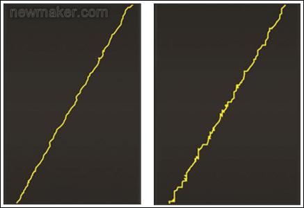 高SNR觸摸屏控制器能夠增強檢測精度,因為它對弱信號的檢測能力更強,并從較大的周邊范圍內收集采樣數據,而較大的檢測范圍提供了更多的參考點,從而觸 摸位置可以被精確算出。圖3揭示了觸摸屏控制器SNR對劃線精度的影響,這是一個機械臂握著一個4mm金屬片所畫的直線。高SNR控制器畫出的直線顯然比 低SNR控制器畫出的直線更平滑。注意這些測量結果都是由相同的觸摸屏傳感器和相同的后處理軟件記錄的,以保證公正的比較。