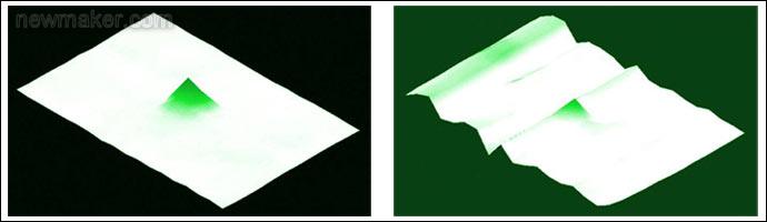 圖4. 4英寸屏上使用2mm導電書寫筆的電容值剖面圖,左側剖面使用高SNR觸摸屏控制器;右側使用低SNR觸摸屏控制器。書寫筆位于綠色錐體頂部;白色平面的 高度代表了背景噪聲。信噪比的增加有效降低了背景噪聲幅度,如左圖所示。如果右圖中的書寫筆移到屏幕的左邊,信號將被噪聲淹沒,書寫筆將無法工作。
