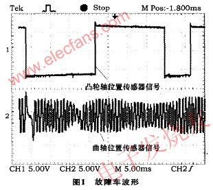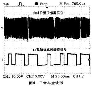 通過圖4還能看出曲軸位置傳感器波形出現2次才與凸輪軸位置傳感器波形重合一次起始位置,這種關系和本車曲軸轉速與凸輪軸轉速比為2:1的關系一致,也正好是1缸上止點的位置,也就是1缸點火正時的基準位置,也決定了其它3個缸的點火時刻。此信號傳輸給腳,ECU就能發出點火信號,起動發動機。否則ECU就不發出點火信號,發動機不能起動。