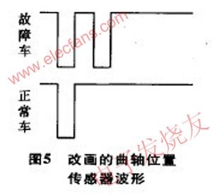 有無波形可得出圖5中的2個波形,ECU只有得到圖5下圖波形才能發出點火信號起動發動機,而ECU得到圖5上的波形不能發出點火信號起動發動機,但在偶然的時刻故障位置產生的波形恰好達到合格的底線時,就可以起動發動機。起動后,ECU對曲軸位置傳感器波形的檢測就不是那么嚴了,因此,發動機起動后不會熄火。也就是此車故障的根本原因。