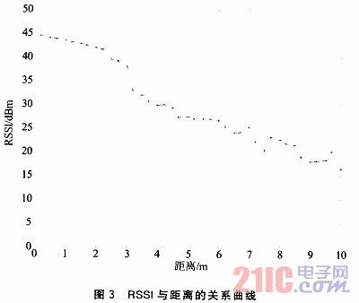 在相同的實驗平臺下,在0~10 m的范圍內,每間隔0.2 m或者0.3 m記錄RSSI值,每個距離均接收100個左右的數據包,對RSSI先進行均值處理,然后得出RSSI值與距離的關系曲線如圖3所示。