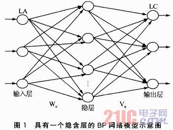 BP網絡是神經網絡中采用誤差反傳算法作為其學習算法的前饋網絡,通常由輸入層、輸出層和隱含層(一層或多層)構成。層與層之間的神經元采用全互連的連接方式,通過相應的網絡權系數w相互聯系,每層內的神經元之間沒有連接。圖1所示為具有一個隱含層的BP網絡模型。其中:LA為BP神經網絡的輸入層,LB為隱層,LC為輸出層,Wir為隱層與輸入層的權值,Vrj為輸出層與隱層的權值。