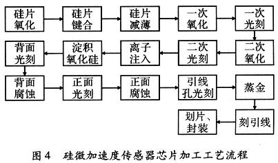 壓阻式傳感器的懸臂梁常采用CVD工藝在硅片上外延生長一層外延層刻蝕而成,文中試用鍵合工藝制造壓阻式加速度傳感器。采用鍵合工藝優點是能得到高質量的外延層,且懸臂梁的厚度通過硅片減薄工藝易于得到保證,精細的硅片單面研磨,厚度誤差可以控制在0.5 μm以內;且不需要電化學自停止腐蝕,依靠EPW腐蝕液對SiO2的腐蝕速度極慢,使得腐蝕過程停止在SiO2層上,從而保證了硅片減薄后的厚度即為彈性梁的厚度。制作的傳感器芯片尺寸3 mm×5 mm,封裝在陶瓷管殼中。選n型硅片,晶向(100),直徑為50mm,厚度為300μm,電阻率為5~12 Ω·cm。傳感器芯片加工工藝流程,如圖4所示。