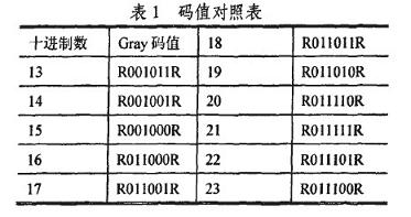 編碼采用格雷碼(Gray)為數(shù)值碼,以某一固定碼寬為參考碼R,它用于標(biāo)尺定位和提高精度。Gray碼是一種絕對編碼方式的無權(quán)碼,它所具有的循環(huán)、單步特性能消除隨機取數(shù)時出現(xiàn)重大誤差的可能,其任意兩個柏鄰整數(shù)之間轉(zhuǎn)換時,只有一個位數(shù)發(fā)生變化,大大減少了由一個狀態(tài)轉(zhuǎn)到下一個狀態(tài)時的邏輯混淆,具有較強的容錯能力。以6位編碼為例,其部分十進制數(shù)與Gray碼的一一對應(yīng)關(guān)系如表1所示。
