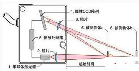 激光發射器通過鏡頭將可見紅色激光射向物體表面,經物體反射的激光通過接受器鏡頭,被內部的CCD線性相機接受,根據不同的距離,CCD線性相機可以在不同的角度下“看見”這個光點。根據這個角度即知的激光和相機之間的距離,數字信號處理器就能計算出傳感器和被測物之間的距離。