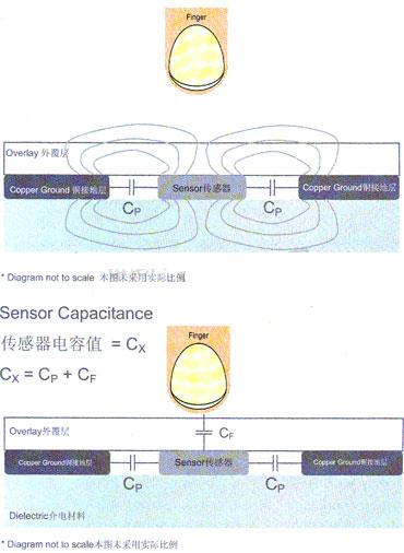 那么,電容式感應(yīng)的工作原埋是什么呢?下面的示意圖顯示了1個電容式感應(yīng)按鈕的橫截面。如圖所示,在外覆層材料之下,存在導(dǎo)電的銅塊區(qū)域和導(dǎo)電的傳感器。在2個導(dǎo)電元件相互之間靠得很近時,就會產(chǎn)生一個電容值,本圖中標(biāo)為Cp,這個電容值是由于傳感器墊板與接地板之間的耦合現(xiàn)象而形成的。Cp屬于寄生電容,典型數(shù)量級任10pF至300pF。傳感器與接地板靠近時也會形成一個邊緣電場,這個電場能夠穿透外覆層。基本上,人體組織也屬于導(dǎo)電體。將一根手指放存邊緣電場附近時,就會增加這個電容系統(tǒng)的導(dǎo)電表面面積。