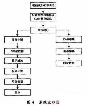 微控制器直接控制慣性傳感器的工作狀態并采集角速度、角加速度等信息,為了達到處理的實時性,當ADIS16365有數據需要發送時,中斷通知微控制器進行讀取。微控制器將采集到的數據進行積分及濾波處理,并將處理后的信息存儲在片內FLASH中。當微控制器接收到數據請求時,通過CAN總線發送數據。圖4為系統主流程圖。