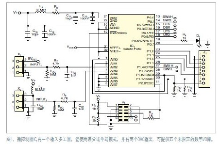 本設(shè)計中的電路包括一個混合信號微控制器、一只USBUART(通用異步接收器/發(fā)射器),還有一個新穎的自適應(yīng)模擬傳感器輸入電路。此電路可以將多種類型的傳感器接到設(shè)計的兩個模擬輸入通道上,在一個USB主機(jī)上控制這些設(shè)備,讀出測量數(shù)據(jù)。USB連接為電路提供電源。在計算機(jī)上就能用簡單指令控制設(shè)備;甚至用終端軟件也可以做測量工作。8051核有免費(fèi)的工具, 便于做編程工作, 如IDE(集成開發(fā)環(huán)境)、調(diào)試器以及C編譯器?! ?br />