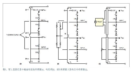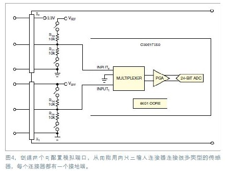 高分辨率ADC與PGA可以直接連接熱電偶(圖6)。通過切換一個通道上的上拉電阻和下拉電阻,就可以實現(xiàn)所需的偏置點。關(guān)掉所有內(nèi)置電阻,就可以采用直接連接的橋式傳感器(如測壓元件和壓力傳感器)。這些情況下,應(yīng)使ADC工作在差分模式。讓所有開關(guān)開路亦適合于采用電位器輸入或IC 傳感器的場合,如SS49E霍爾效應(yīng)磁場傳感器?! ?/p>