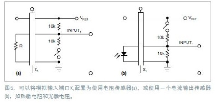 模擬輸入架構(gòu)能夠直接連接多種類型的傳感器。例如,可以在接地端與輸入端之間連接熱敏電阻或光敏電阻,并接通上拉電阻,構(gòu)成一個分壓器;片上的ADC可以直接對這個分壓器的輸出做數(shù)字化(圖5)。這種方案還采用了比率工作方式,意味著ADC使用與分壓器驅(qū)動電壓相同的電壓基準(zhǔn)。電流輸出傳感器也可以像光電二極管那樣連接,即直接連到接地端與輸入端之間。切換到下拉電阻,使光電流能產(chǎn)生一個電壓。