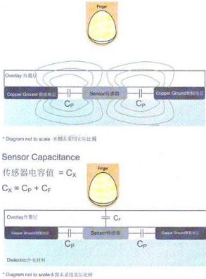 那么,電容式感應的工作原埋是什么呢?下面的示意圖顯示了1個電容式感應按鈕的橫截面。如圖所示,在外覆層材料之下,存在導電的銅塊區域和導電的傳感器。在2個導電元件相互之間靠得很近時,就會產生一個電容值,本圖中標為Cp,這個電容值是由于傳感器墊板與接地板之間的耦合現象而形成的。Cp屬于寄生電容,典型數量級任10pF至300pF。傳感器與接地板靠近時也會形成一個邊緣電場,這個電場能夠穿透外覆層。基本上,人體組織也屬于導電體。將一根手指放存邊緣電場附近時,就會增加這個電容系統的導電表面面積。