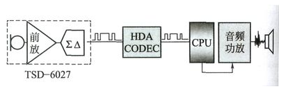 目前國際上IC廠商推向市場的內(nèi)置式數(shù)字傳聲器IC芯片普遍采用∑一△模數(shù)轉(zhuǎn)換編碼格式,此編碼格式與相關(guān)應(yīng)用設(shè)備采用的DSP及CODEC芯片的數(shù)字傳聲器輸入接口格式相兼容。