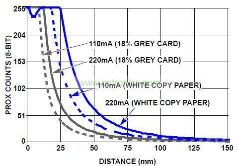 對于接近傳感器(Prox)數據轉換,內置驅動器控制內部紅外LED發出紅外光,用于接近傳感器的ADC將反射的紅外光強度轉換為數字信號。該ADC可消除周圍環境光中的紅外光干擾(如太陽光),其轉換時間為540μs。