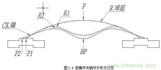 彈片自由狀態(tài)時,支撐點為P1,當(dāng)外力“F”開始向下施力時,彈片開始變形及位移,此時開始產(chǎn)生曲線。在以P1為支撐點時,外力“F”造成彈片變形,會產(chǎn)生最小的R1,此時的外力“F”即為彈片的OF值。過了彈片OF值位置時,支撐點P1會開始向P2位移,只要P1一位移,則R1又會變大,造成OF值變小,此時曲線即產(chǎn)生向下曲線(CK)。當(dāng)達到P2時,即為P2支撐之最大R2,此時即達到彈片的BP點(最小OD點)。若此時外力“F”繼續(xù)施力,則曲線又會向上產(chǎn)生曲線,上述過程如圖1.4所示。