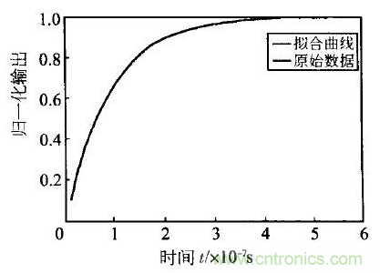 基于上述思想,若已知輸入、輸出信號, 可通過曲線擬合及線性回歸法得出RC。對式(3) 進行擬合,在擬合過程中, 加入一定的白噪聲。若R = 1000 Ω,電容C = 50 p F ,則擬合曲線如圖4 所示