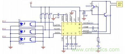 AD421是ADI公司推出的一款單片高性能數模轉換器(DAC)。它由16位數字信號以串行方式輸入,4~20 mA電流輸出,在智能儀表方面應用廣泛。AD421與單片機的連接主要有串行數據輸入端和控制端,在時鐘CLOCK作用下,輸入移位寄存器把DATA引腳上的數據逐位讀入,LATCH鎖存脈沖把寄存器中的數據鎖存到DAC中。根據其工作原理,AD421與C8051F020芯片的接口電路如圖3所示。AD421的數據接口和單片機P3.0口相連,用來接收16位的串行數據。單片機P3.6口用來產生時鐘信號,而P3.5口用來產生鎖存信號。在實際應用中,為了保證信號的傳輸,一般要在單片機和AD421之間加入隔離器件,實現通訊的隔離,常用的方法有使用ADI推出的ADUM系列隔離器件,比如ADuM 1310,或者使用光耦。在這里,采用光耦來實現通訊的隔離。