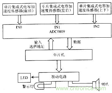 設計方案如圖1所示:包括傳感器及外圍電路、信號處理裝置、顯示報警電路等3部分。傳感器及外圍電路封裝于小型屏蔽容器內,固定于導彈載行車上,ADXL50加速度傳感器采集振動加速度信號,并輸出相應的電壓信號;信號處理部分接收到傳感器采集來的模擬電壓信號,對其進行模/數轉換,將加速度的值顯示于LED上,然后進行數據判斷與處理,當超過安全范圍時給出報警,提醒司機注意駕駛。