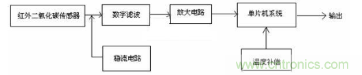 檢測電路由紅外二氧化碳傳感器、數(shù)字濾波電路、放大電路、穩(wěn)流電路、單片機(jī)系統(tǒng)、溫度補(bǔ)償?shù)冉M成。基本原理是紅外二氧化碳傳感器將檢測到的二氧化碳?xì)怏w濃度轉(zhuǎn)換成相應(yīng)的電信號,輸出的電信號分別經(jīng)過濾波、放大處理,輸入到單片機(jī)系統(tǒng),并經(jīng)溫度和氣壓補(bǔ)償?shù)忍幚砗螅蓡纹瑱C(jī)系統(tǒng)輸出送顯示裝置顯示其測量值。