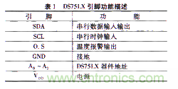 DS75LX工作電壓為1.7 V到3.7 V。除了基本的測溫功能外,DS75LX還具有溫度報警功能,允許用戶通過軟件設置報警溫度的門限值。DS75LX測溫范圍為-55℃~+125℃,當測溫范圍為-25℃~+100℃時,測量精度為±2℃。DS75LX同時具有可編程的9至12位的溫度數據輸出格式。輸出的溫度數據為12位時,其分辨率可達0.0625℃。該傳感器具有三個地址引腳,可設置為三種狀態中的任意一種:接GND、VDD,或懸空,可設置27種地址組合。例如A2、A1和A0分別為接電源、接地和懸空時,DS75LX的器件地址為0101110。圖1是DS75LX的引腳排列,各功能描述如表1所示。