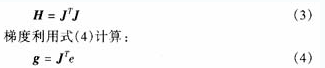 式中,J為Jacobian矩陣,包括網(wǎng)絡(luò)誤差項(xiàng)相對(duì)于權(quán)重和閾值的一階微分 ,e為網(wǎng)絡(luò)的誤差項(xiàng)。Jacobian矩陣可以利用標(biāo)準(zhǔn)的BP算法得出,這比直 接計(jì)算Hessian矩陣簡(jiǎn)單得多。迭代式為: